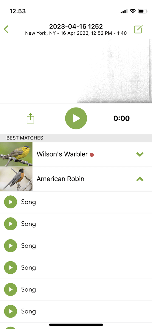 Users tap on the image or name of an identified bird to be taken to the section in the file where that bird was identified. Nowhere on the interface does that timecode show up until the user taps the button. Furthermore, there is no indication of when the identified bird call ends. These recordings contain a lot of overlap of birdcalls and other noises. It can be difficult for users to determine what part of the audio Merlin has identified as belonging to a particular bird.